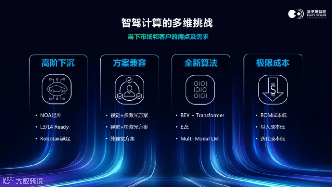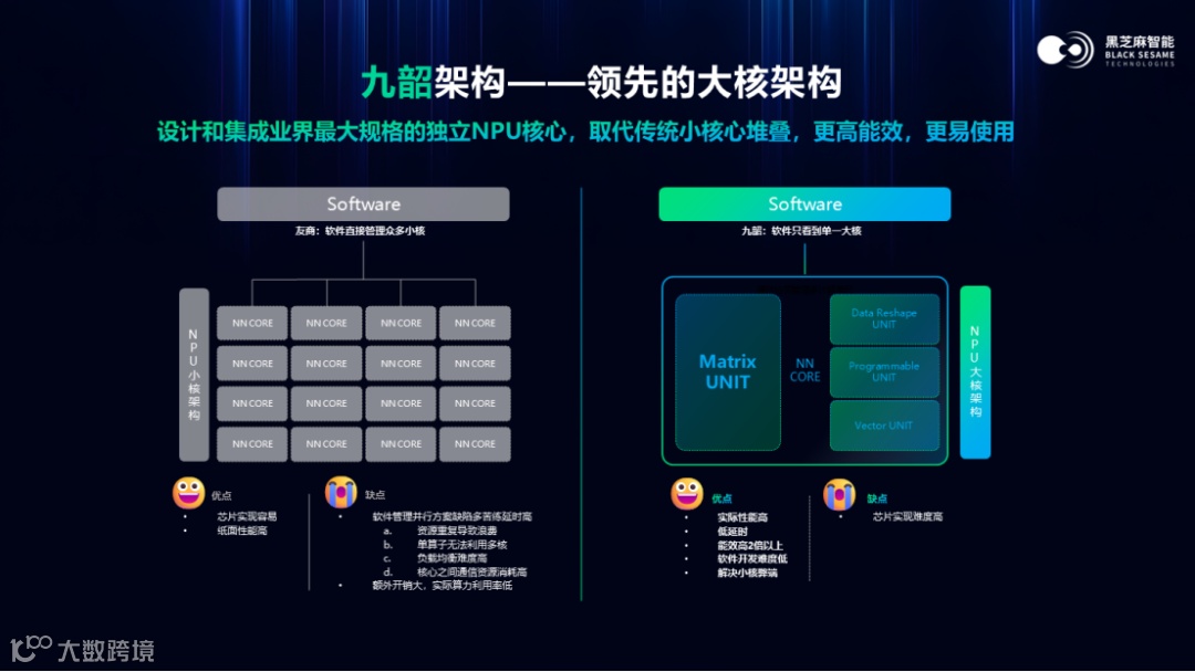 与此同时,黑芝麻智能重磅推出了自研NPU新架构——黑芝麻智能“九韶”,九韶是黑芝麻智能为满足自动驾驶技术需求而推出的高性能 AI 芯片的计算核心。九韶NPU采用了领先的大核架构,支持智驾大模型的实时推理,降低算法计算的延迟。同时,九韶NPU也是业界最高安全等级的NPU,能够确保自动驾驶系统的高安全性和确定性。此外,九韶NPU还具备高算力、高能效和高带宽等特点,为智能驾驶技术的迭代提供了坚实基础。