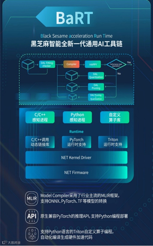 为了充分发挥九韶NPU的潜力,黑芝麻智能还研发了新一代通用AI工具链BaRT和新一代双芯粒互联技术BLink。BaRT支持多种流行框架和模型的转换,使得开发者能够更加便捷地利用九韶架构进行AI模型的开发和部署。而BLink技术则为算力扩充提供了高效解决方案,支持更大规模模型的算力需求,为算法长期演进做好准备。