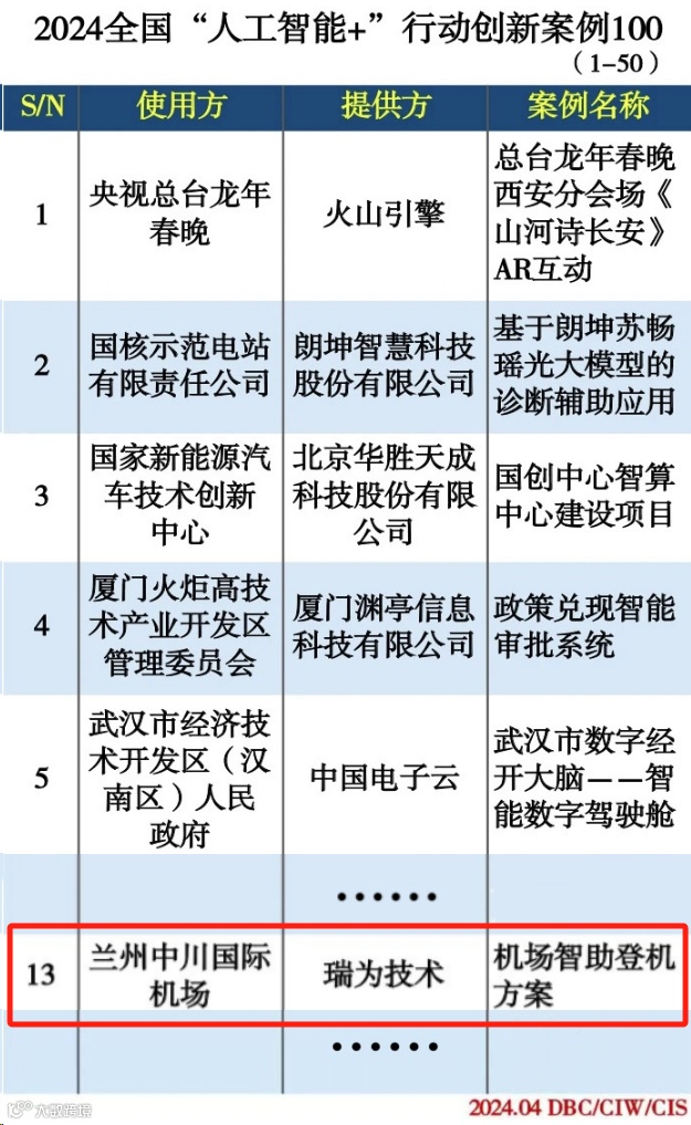 近日,中国科学院主管、科学出版社主办的商业期刊《互联网周刊》(CIW)联合德本咨询(DBC)、中国社会科学院信息化研究中心(CIS)发布了2024全国“人工智能+”行动创新案例百强榜单,瑞为技术凭借兰州中川国际机场的“机场智助登机方案”位居榜单前列。