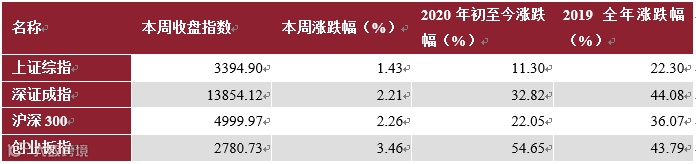 本周上证综指收涨1.43%报3394点,深证成指收涨2.21%报13854点,沪深300收涨2.26%报4999点,创业板指收涨3.46%报2780点。