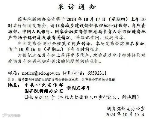 国新网10月15日消息,国务院新闻办公室将于10月17日(星期四