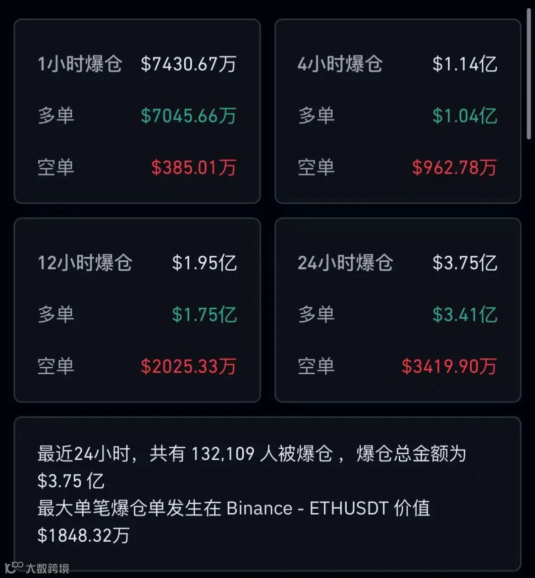 据Coinglass数据,过去24小时,虚拟货币市场共有超13万人爆仓,爆仓总金额为3.75亿美元(约合人民币27.1亿元),其中多单爆仓3.41亿美元,空单爆仓3419.9万美元。