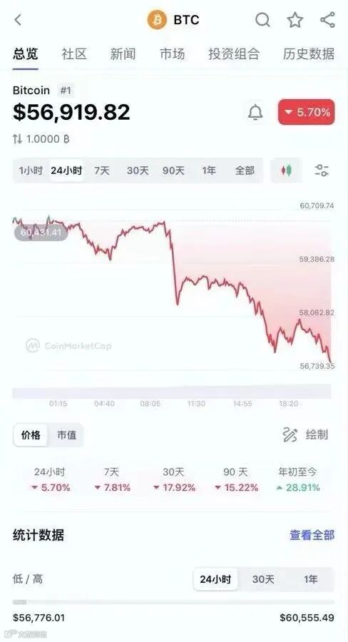 截至发稿,比特币价格持续震荡,暂报56919.82美元/枚,24小时跌幅达5.7%