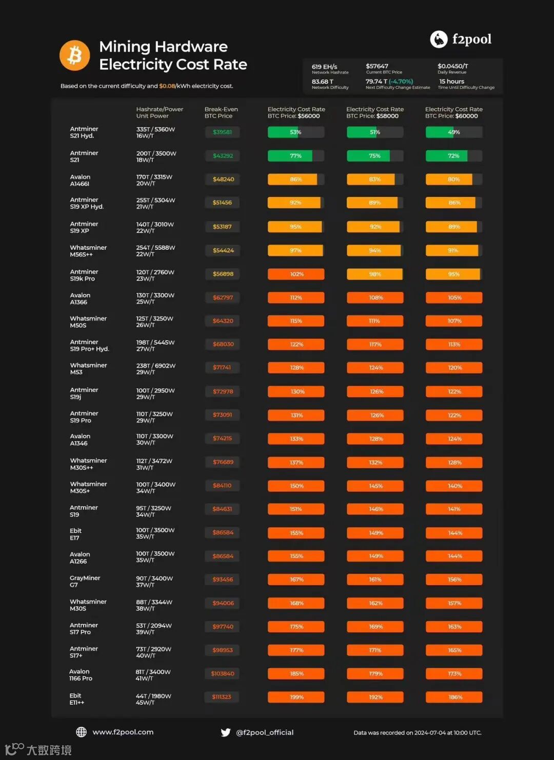 f2pool数据显示,随着比特币的交易价格跌破58000美元,低效率的“矿机”在当前市场条件下面临挑战。以每度电0.06美元计算,比特币“矿机”蚂蚁S19、神马M30S+、神马M33S+等已达关机币价(挖矿的成本价),即开机就亏损。