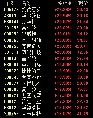 半导体板块今日走强,多股实现“30CM”或“20CM