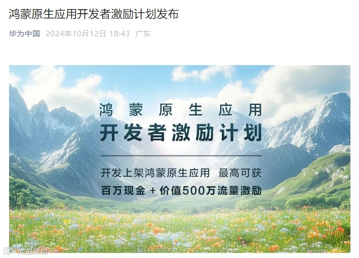 据“华为中国”微信公众号10月12日消息,华为发布鸿蒙原生应用开发者激励计划。