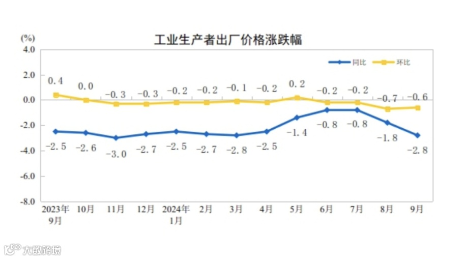9月份,全国工业生产者出厂价格指数(PPI)同比下降2.8%,环比下降0.6%。1月至9月平均,工业生产者出厂价格比上年同期下降2.0%。