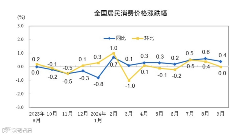 国家统计局10月13日发布数据显示,9月份,全国居民消费价格指数(CPI)同比上涨0.4%,环比持平。1月至9月平均,全国居民消费价格比上年同期上涨0.3%。