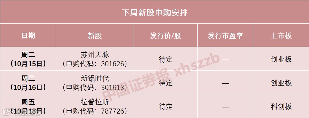 天脉,下周三(10月16日)可申购新铝时代,下周五(10月18日)可申购拉普拉斯。
