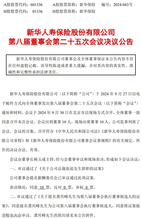 记者从相关人士处获悉,新华保险前任总裁张泓于9月到龄退休,9月30日已经正式递交辞职函。