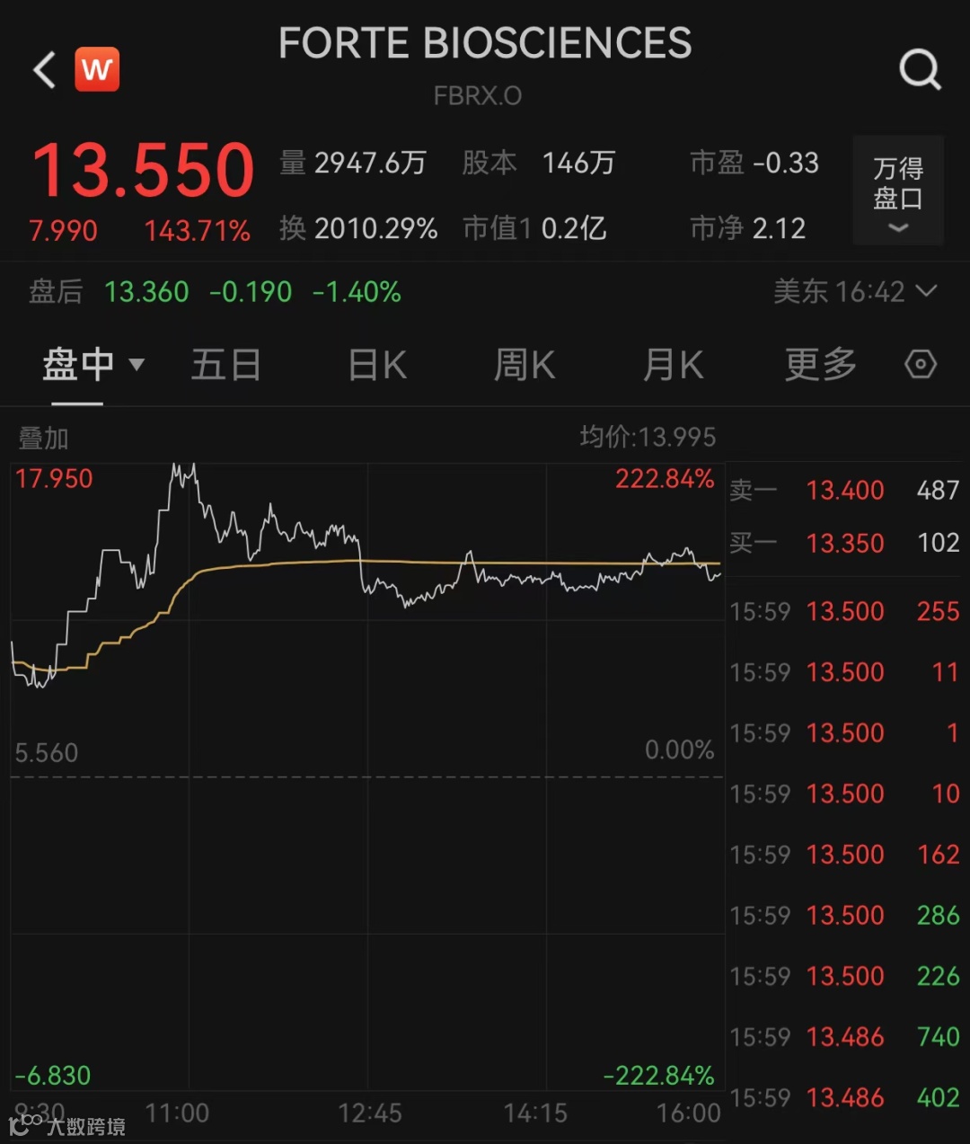 Forte Biosciences数次熔断,收涨143.71%,盘中一度涨逾220%。