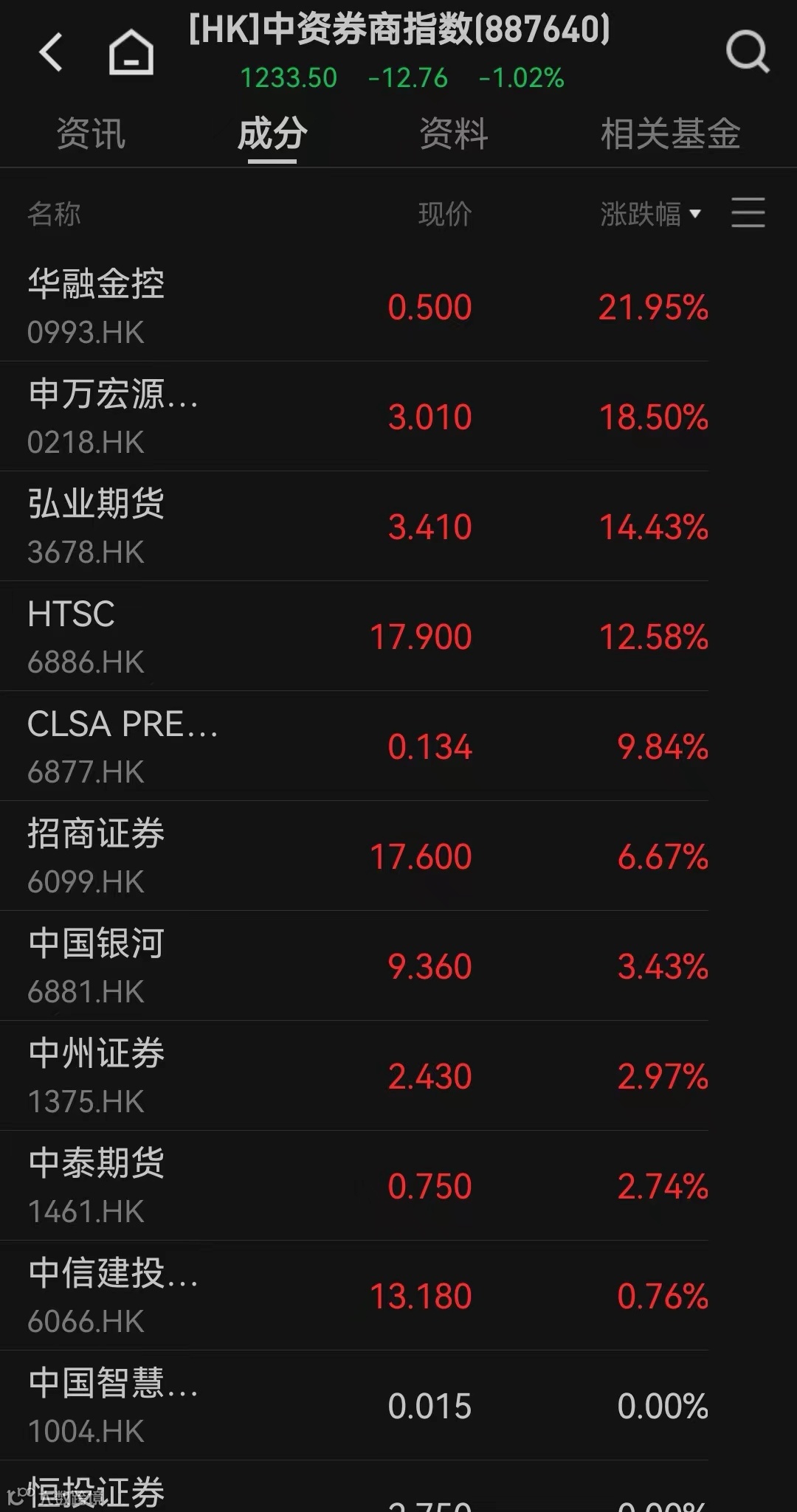 中资券商股早上开盘后拉升,随后大幅下跌,中资券商指数盘中一度跌超11%,午后再度拉升,至收盘下跌1.02%。华融金控涨超21%,申万宏源香港涨超18%,弘业期货涨超14%,华泰证券涨超12%,招商证券、中国银河、中州证券等也上涨。