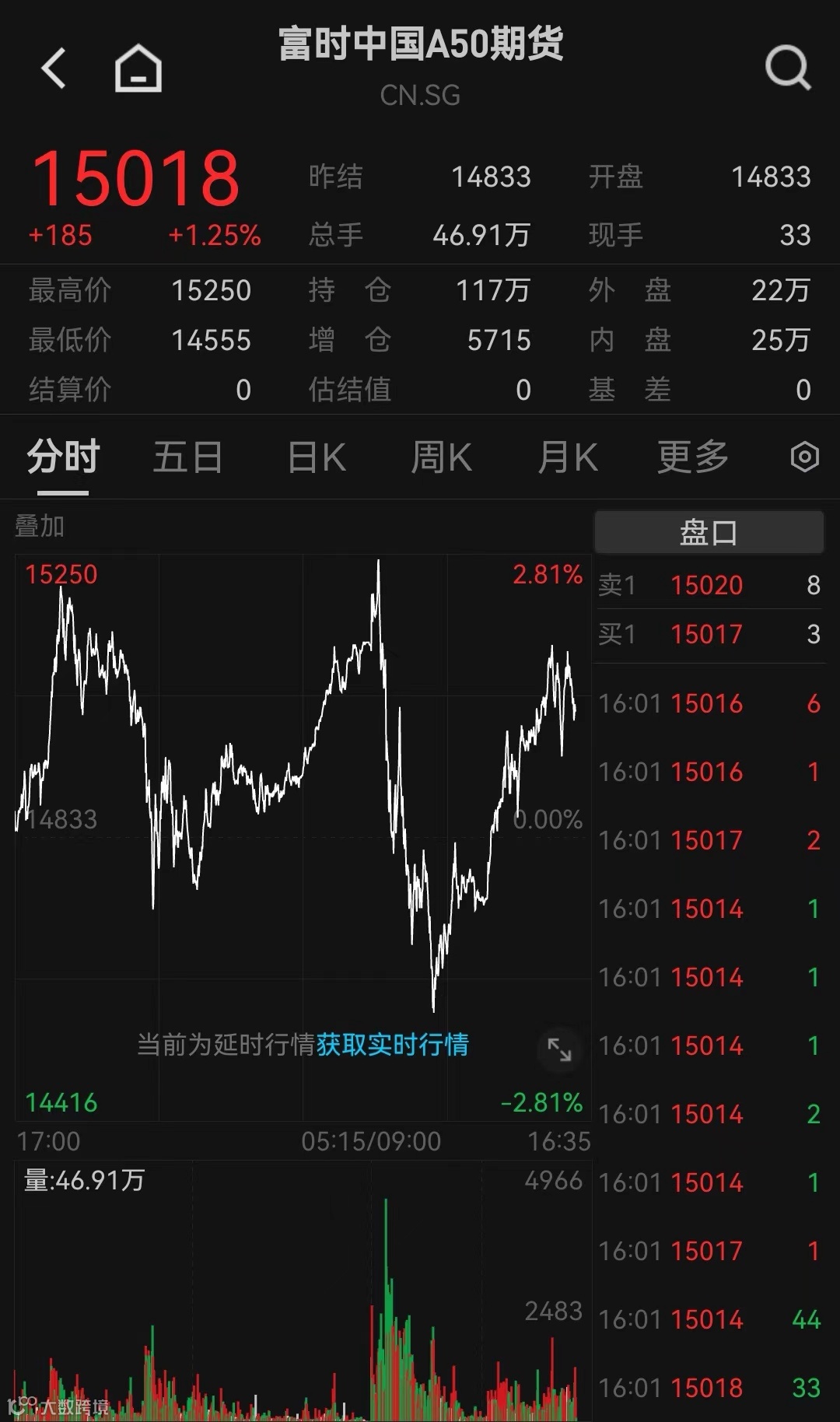 富时中国A50指数期货午后转涨,截至16:11上涨1.25%,此前一度跌近2%。