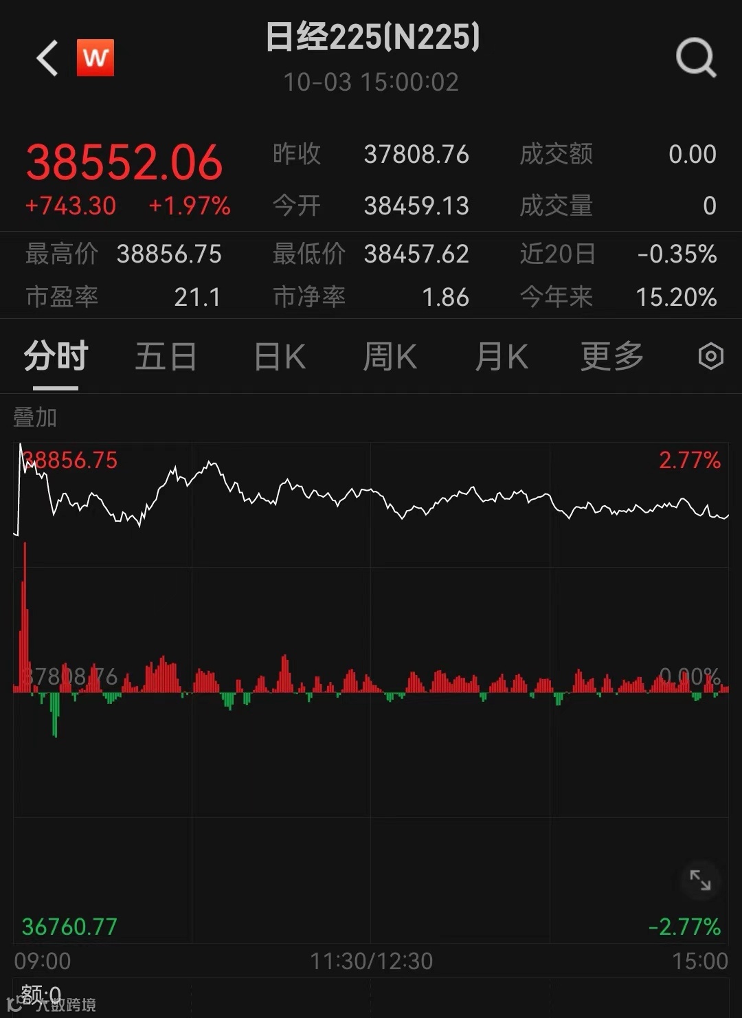 10月3日,亚太主要股指收盘普遍上涨,日经225指数收涨1.97%报38552.06点。澳洲标普200指数收涨0.09%报8205.2点。新西兰NZX50指数收涨0.97%报12572.66点。