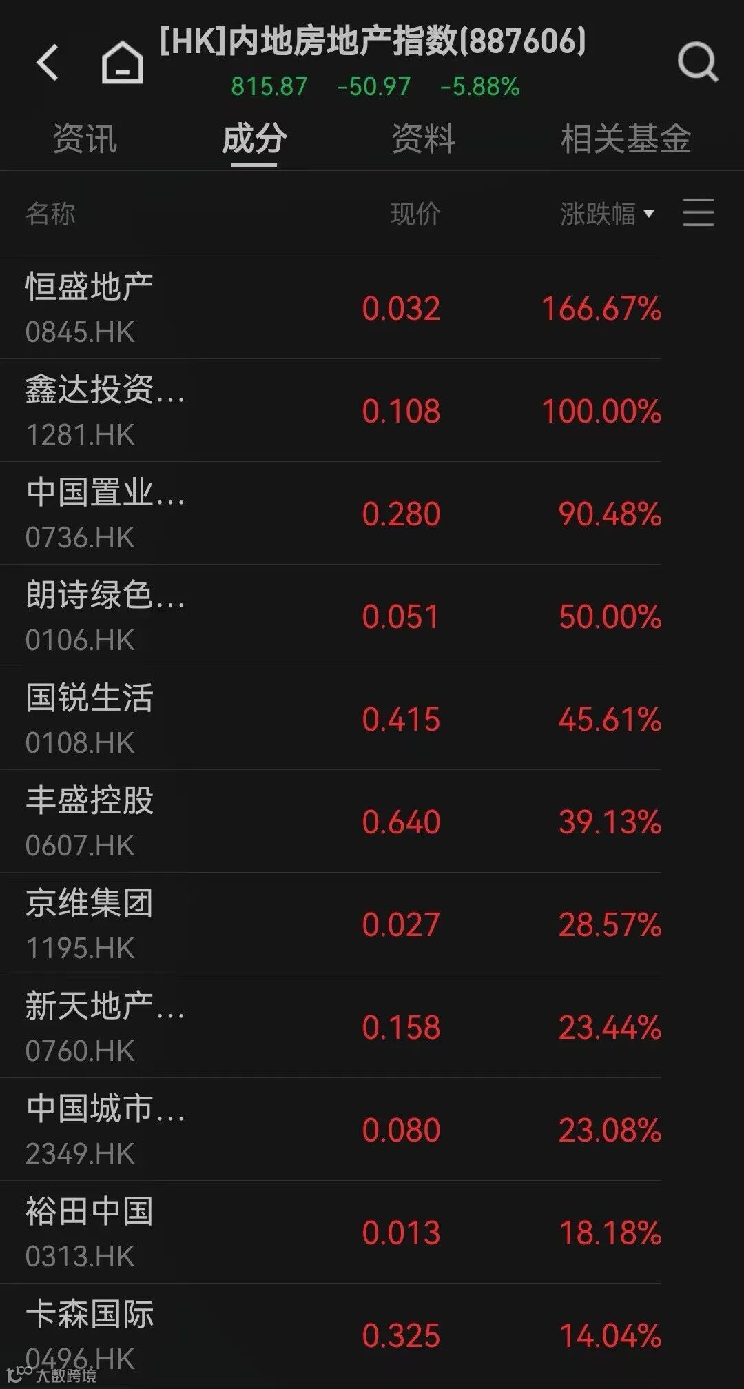 内地房地产股上午大幅回调,不过下午跌幅收窄,内地房地产指数收跌5.88%。世茂集团、绿地香港、合生创展集团、融创中国、易居企业控股、旭辉控股集团、佳兆业集团跌超20%。恒盛地产午后涨幅扩大,截至收盘涨166.67%;鑫达投资控股、中国置业投资、朗诗绿色管理、国锐生活、京维集团等均涨超25%。