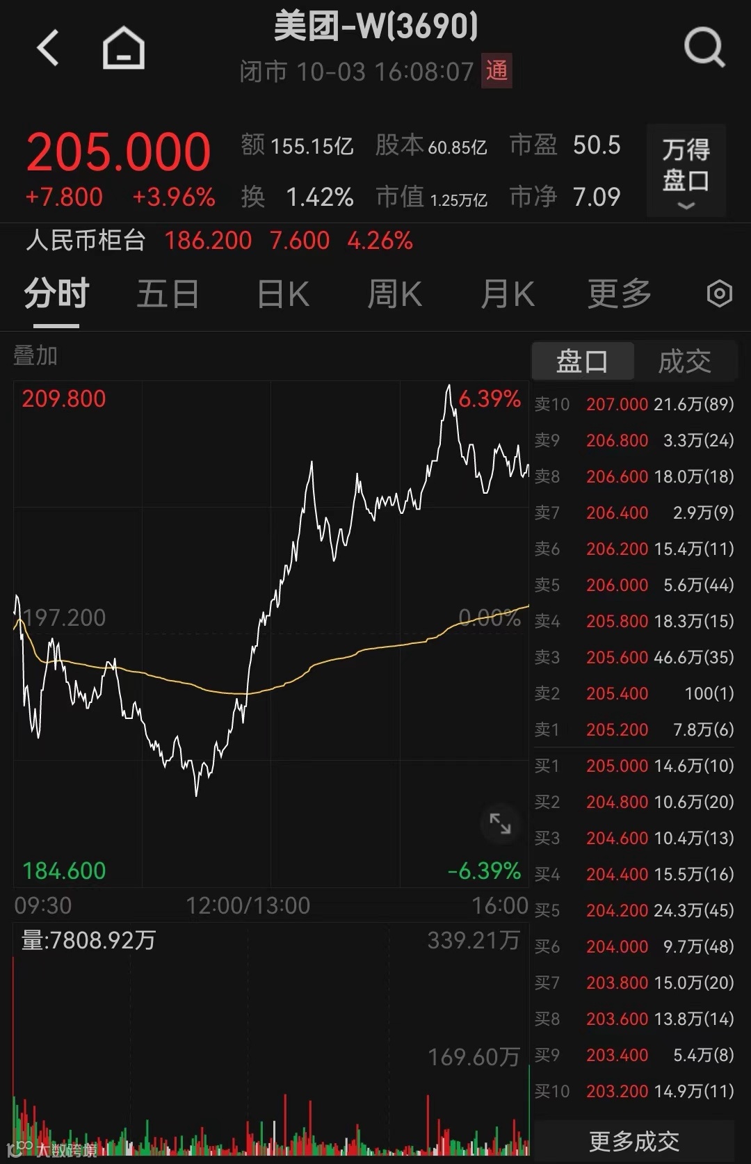 美团-W午后一度涨超4%,至收盘上涨3.96%,股价突破200港元大关。
