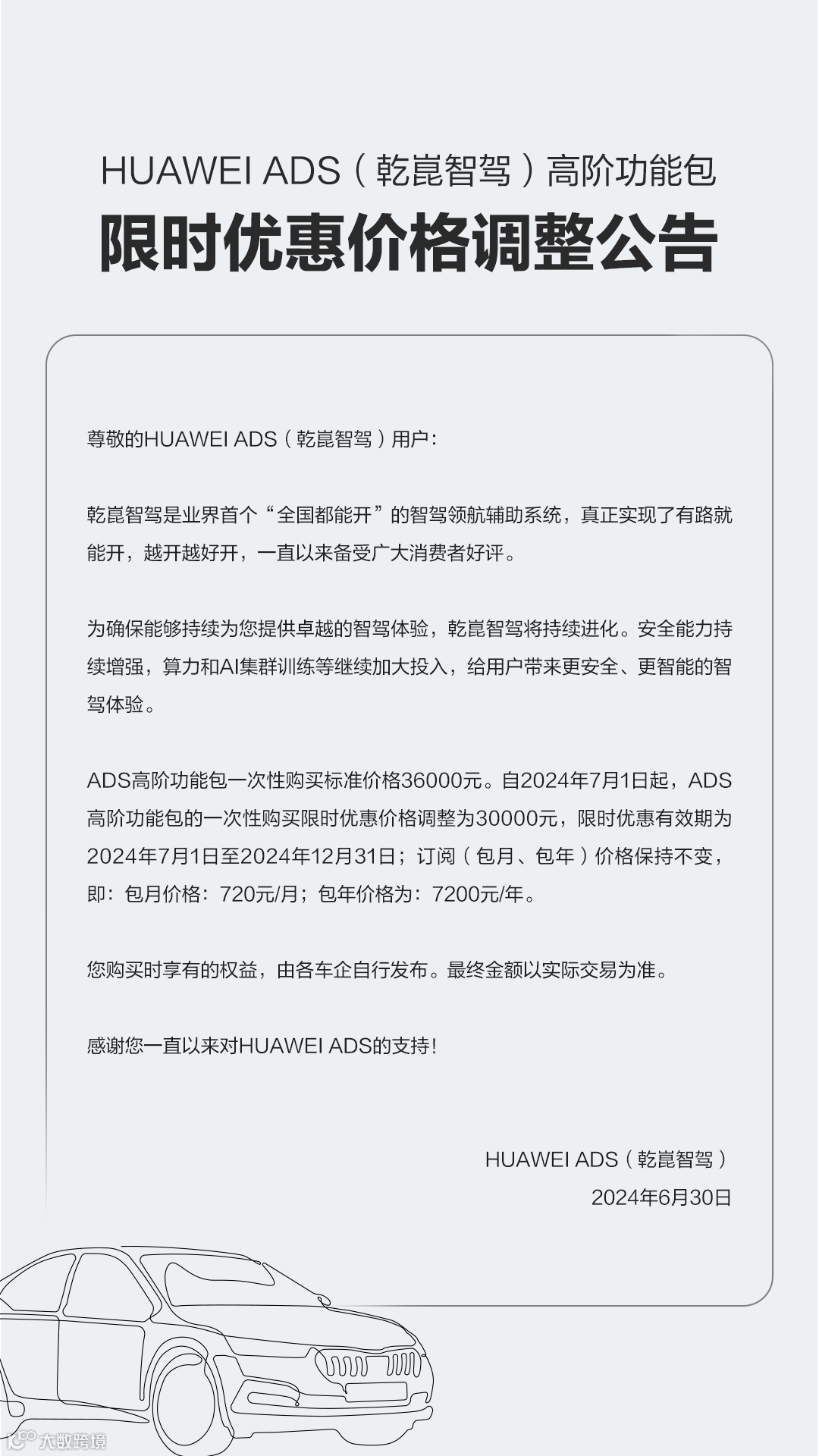 6月30日深夜,华为智能汽车解决方案微信公众号发布公告称,HUAWEI ADS(乾崑智驾)高阶功能包推出限时优惠价格。根据公告,