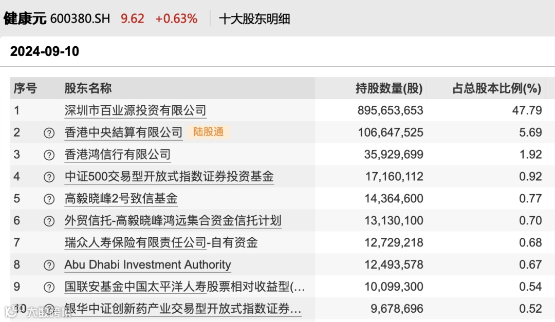 截至9月10日健康元前十大股东榜单 来源:Wind