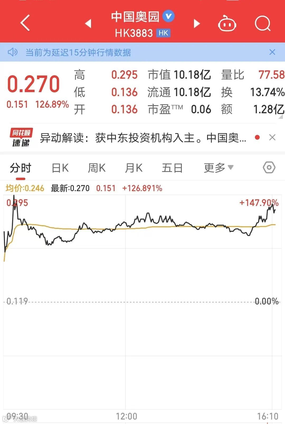 港股上市公司中国奥园今日盘中一度涨超147%。消息面上,9月20日晚公司公告,获中东投资机构Multi Gold Group Limited入主,后者实控人Alobeidli将获任为中国奥园董事局主席。