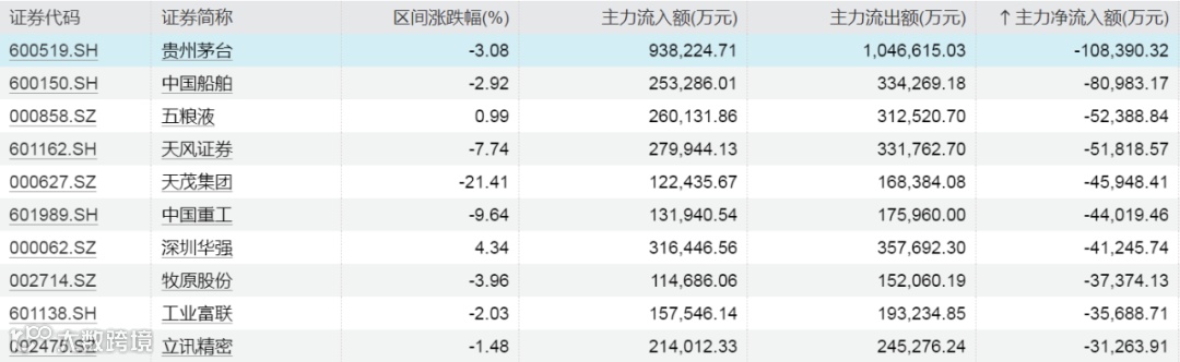 贵州茅台、中国船舶、五粮液主力资金净流出金额居前,分别达10.84亿元、8.10亿元、5.24亿元。本周有7只股票主力资金净流出金额超4亿元,市场表现上,这些股票本周多数下跌,天茂集团跌幅超过21%,贵州茅台连创调整新低。