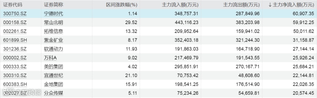 从个股情况来看,Wind数据显示,本周3个交易日主力资金净流入宁德时代、常山北明、拓维信息金额居前,分别达6.09亿元、5.99亿元、5.00亿元。本周有10只股票主力资金净流入金额超2亿元,市场表现上,这些股票本周均上涨,常山北明涨幅接近30%,本周出现2个涨停。