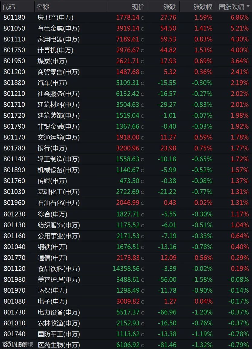 Wind数据显示,本周申万一级31个行业中,房地产、有色金属、家用电器行业涨幅居前,分别上涨6.86%、5.21%、4.30%;医药生物、国防军工、农林牧渔行业跌幅居前,分别下跌0.79%、0.78%、0.37%。