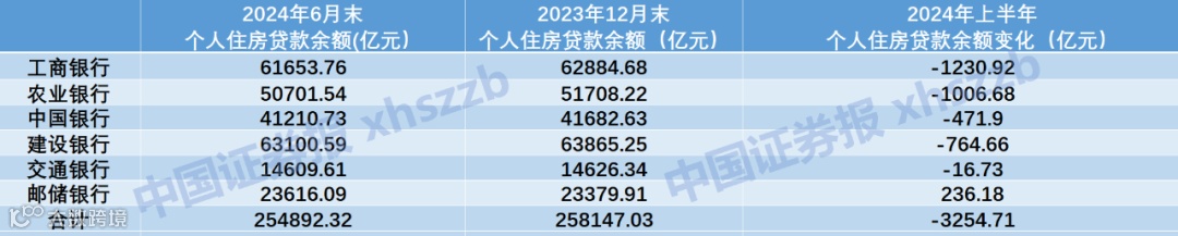 从披露的2024年半年报来看,截至2024年半年末,工商银行、农业银行、中国银行、建设银行、交通银行、邮储银行六大国有银行个人住房贷款金额合计约25.49万亿元,较2023年底合计减少3200多亿元。其中,工商银行、农业银行较2023年底个人住房贷款余额减少超千亿元。