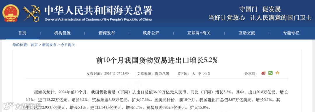 2024年前10个月,我国货物贸易(下同)进出口总值36.02万亿元,同比(下同)增长5.2%。