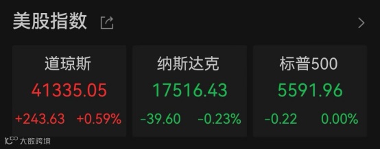 美股三大股指在集体高开后,临近尾盘突然跳水。截至收盘,道指涨0.59%,报41335.05点,盘中一度续创历史新高;纳指跌0.23%,报17516.43点;标普500指数收平,报5591.96点。