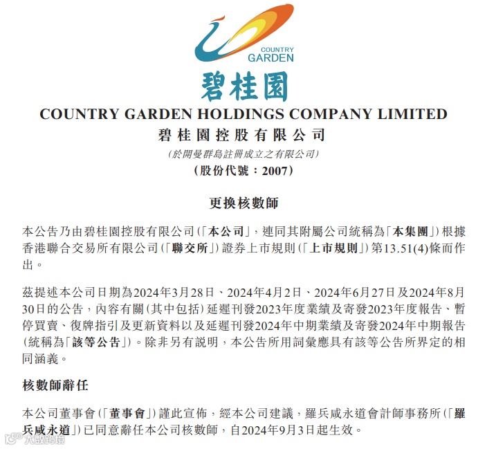 碧桂园方面表示,罗兵咸永道(普华永道)一直为公司提供审计服务,但鉴于近期与公司核数师相关的事项以及市场信息,普华永道未能满足公司对刊发2023年年度经审核财务报表的时间表需求。考虑到继续聘请一名核数师并在切实可行的情况下尽快完成业绩审核工作符合公司、公司股东以及债券人等相关利益方的最佳利益,经公司与普华永道协商,普华永道同意辞去公司核数师职务,自2024年9月3日起生效。公司将委任中汇安达会计师事务所为新任核数师,以填补普华永道辞任后的空缺,自2024年9月5日起生效。