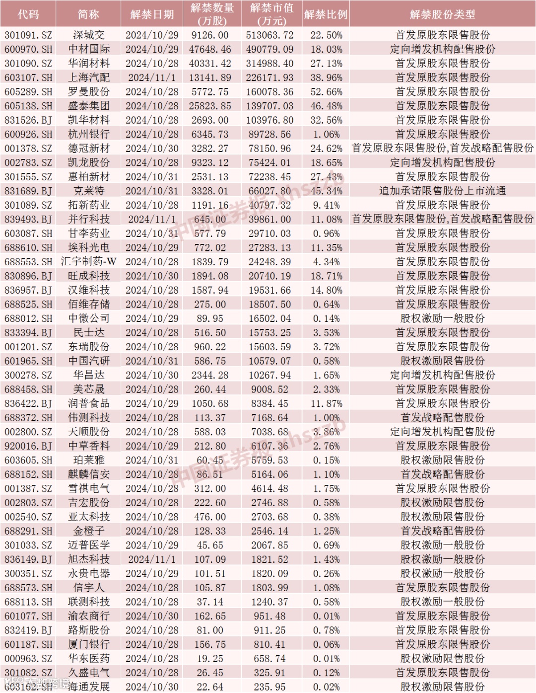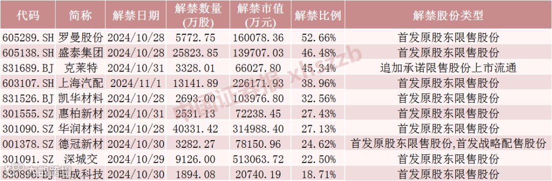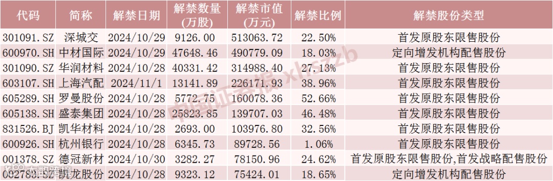 具体来看,Wind数据显示,深城交10月29日将解禁9126.00万股,均为首发原股东限售股份。中材国际10月29日将解禁4.76亿股,均为定向增发机构配售股份。华润材料10月28日将解禁4.03亿股,均为首发原股东限售股份。