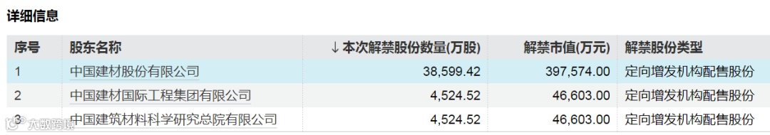 解禁市值第二大的中材国际解禁股东为中国建材股份有限公司、中国建材国际工程集团有限公司、中国建筑材料科学研究总院有限公司这三个股东,其中中国建材股份有限公司为中材国际第一大股东。这些股东下周解禁部分股份来自于中材国际2021年11月完成的定增,彼时的定增发行价为5.64元/股。