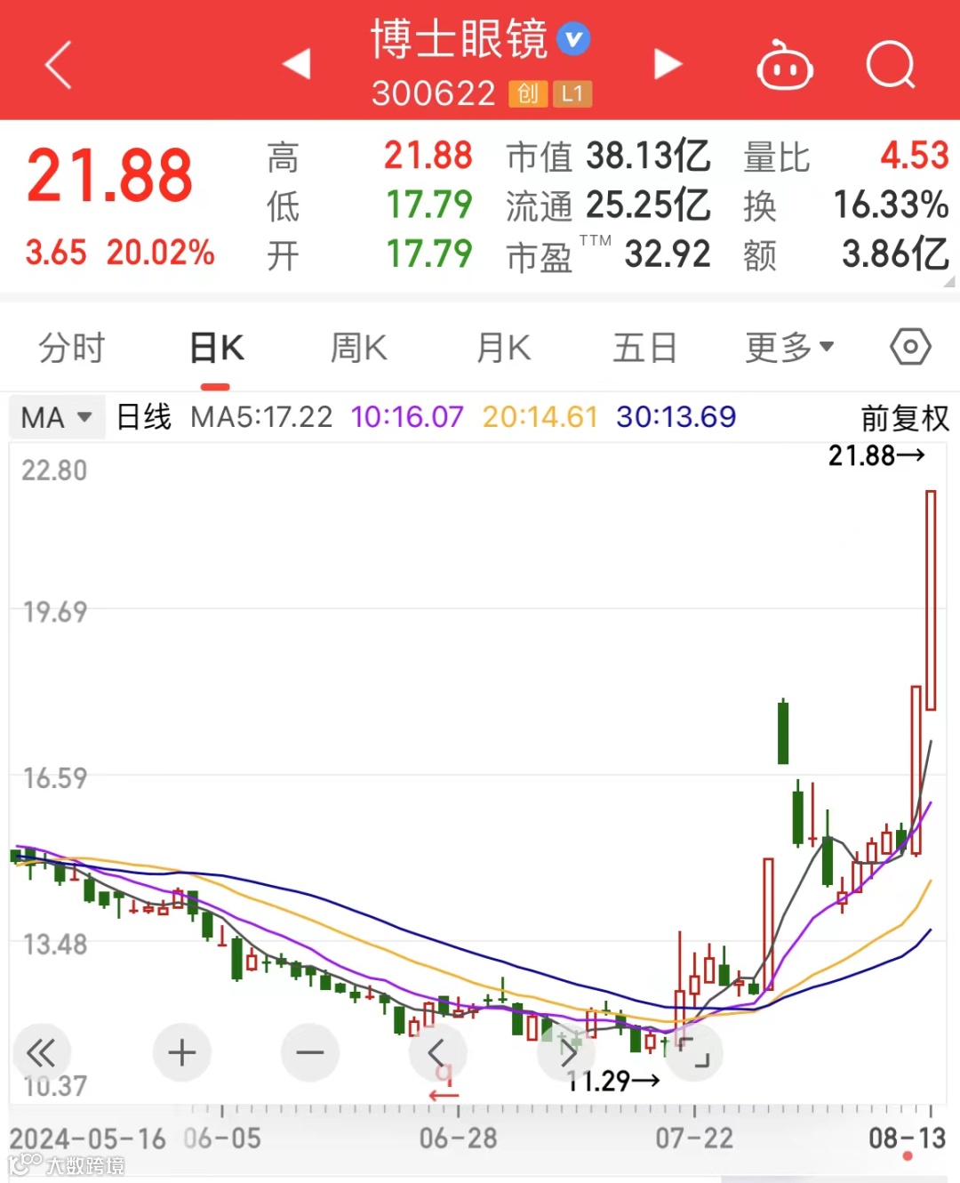 今天上午,AI智能眼镜概念大涨,龙头股博士眼镜20%涨停,迎来两连板。此外,亿道信息、伟时电子等个股也涨停,佳禾智能、锦富技术等概念股大涨。