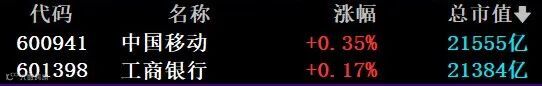 今天早盘,工商银行快速拉升,最高涨至6.08元,总市值一度超过中国移动,短暂成为A股新的市值“一哥”。随后,中国移动发力、工商银行回落,中国移动总市值又超过工商银行。截至上午收盘,中国移动总市值为21555亿元,工商银行总市值为21384亿元。