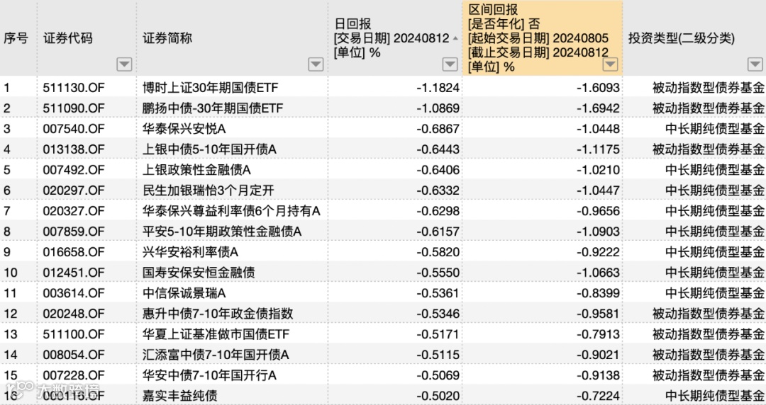 悦A、上银政策性金融债A、民生加银瑞怡3个月定开、平安5-10年期政策性金融债A等中长期纯债型基金当日基金净值跌幅超60个基点;兴华安裕利率债A、国寿安保安恒金融债、中信保诚景瑞A等当日也跌超50个基点。