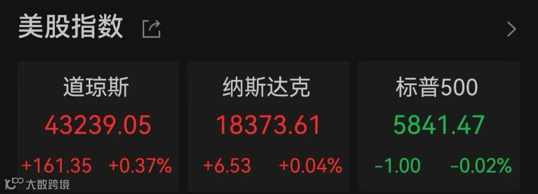 当地时间10月17日,美股三大股指涨跌不一,道指续创历史新高。截至收盘,道指、纳指分别涨0.37%、0.04%,标普500指数下跌0.02%。