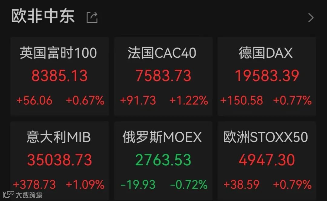 欧洲股市主要股指多数上涨,其中,法国CAC40指数、意大利MIB指数均涨逾1%。