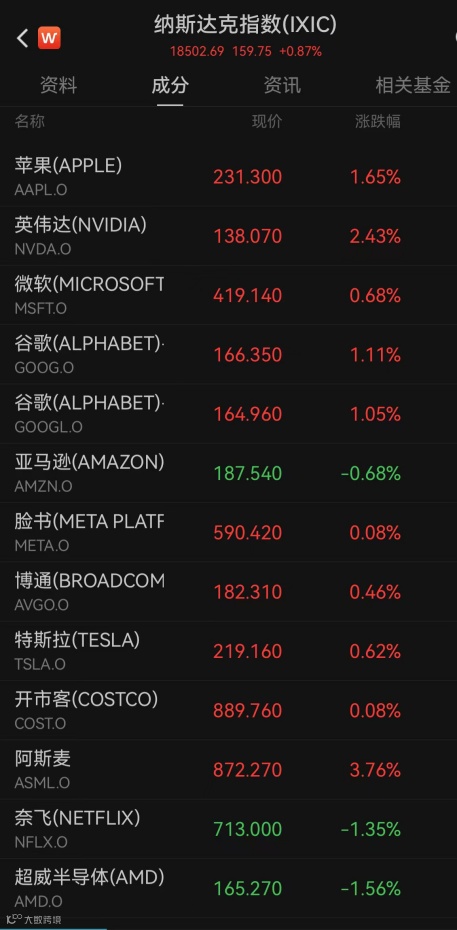 美股三大指数全线走高,截至收盘,道琼斯工业指数、纳斯达克指数、标普500指数分别上涨0.47%、0.87%、0.77%,