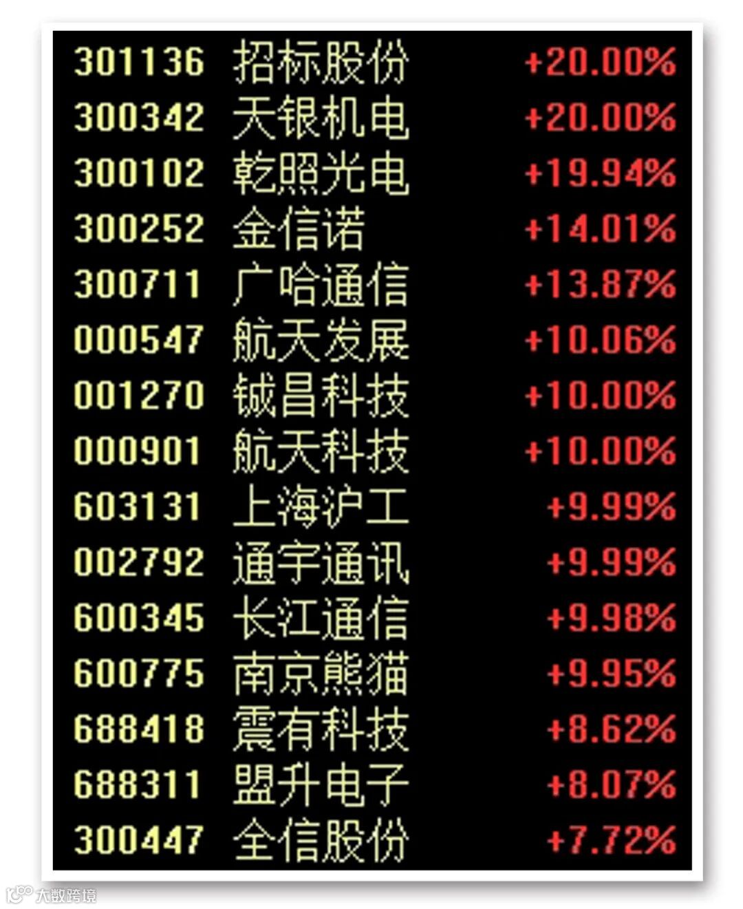 板块中,招标股份、天银机电等股实现“20CM”涨停,广哈通信、金信诺涨逾13%,航天发展、铖昌科技、航天科技、