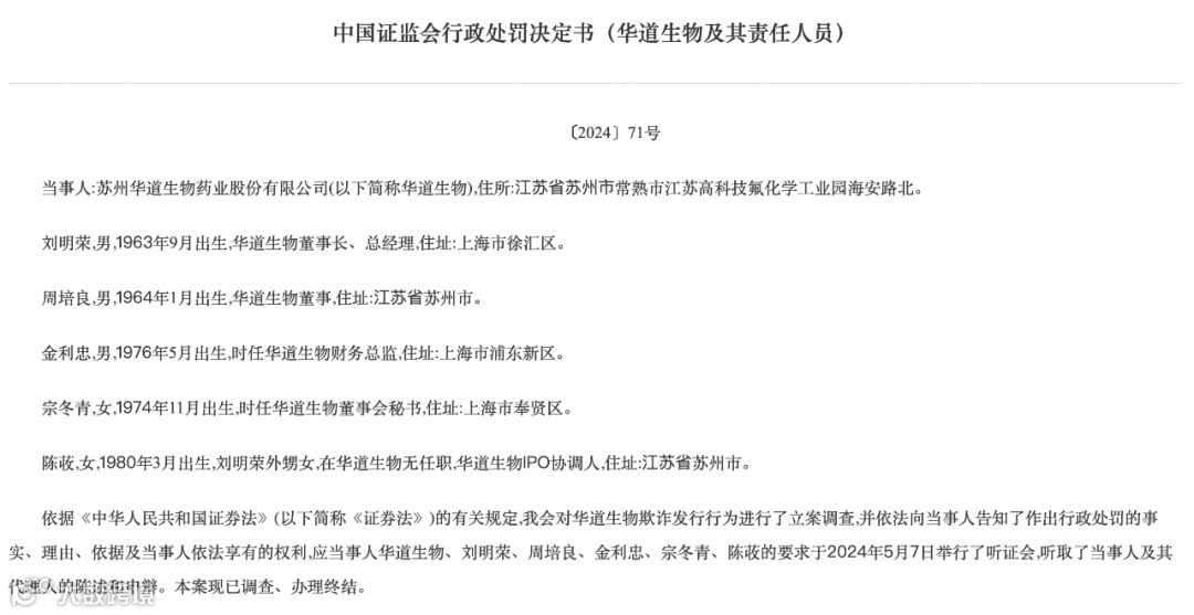 证监会指出,对华道生物欺诈发行的违法行为,华道生物董事长、总经理刘明荣知悉并同意华道生物2019年至2021年虚增销售收入和利润的行为,是直接负责的主管人员。