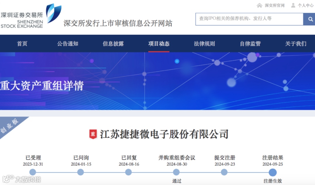 同日,深交所上市公司捷捷微电重组项目注册生效,成为“并购六条”发布后全市场首单注册生效的重组项目。