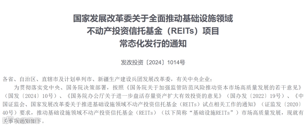 国家发展改革委网站7月26日发布《关于全面推动基础设施领域不动产投资信托基金(REITs)项目常态化发行的通知》。