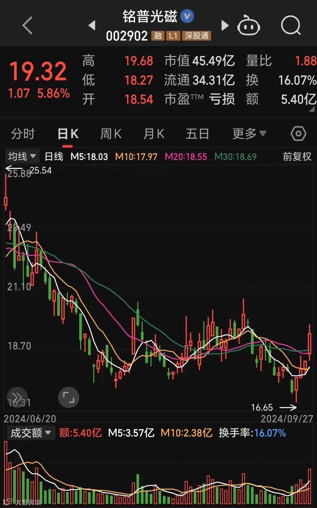 9月27日,铭普光磁股价收报19.32元/股,上涨5.86%,最新市值为45.49亿元。