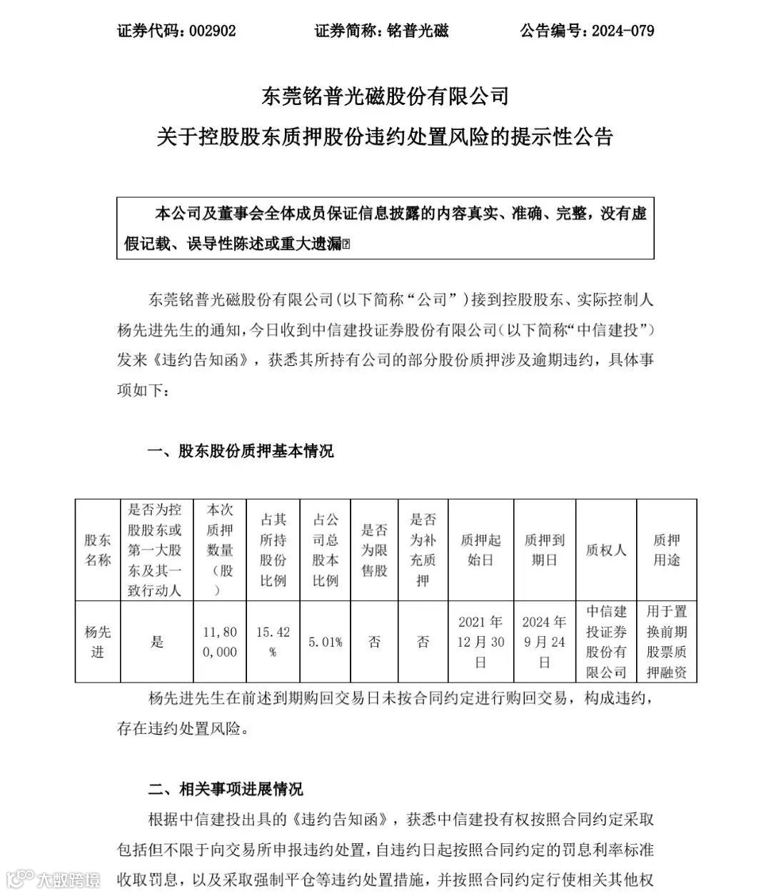 9月27日,铭普光磁发布《关于控股股东质押股份违约处置风险的提示性公告》。公告称,公司接到控股股东、实际控制人杨先进的通知,收到中信建投证券发来的《违约告知函》,获悉其所持有公司的部分股份质押涉及逾期违约。杨先进在到期购回交易日未按合同约定进行购回交易,构成违约,存在违约处置风险。