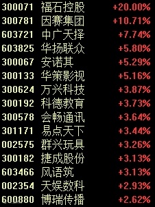 Sora概念今日大涨,福石控股“20CM”涨停,因赛集团、中广天择等股跟涨。
