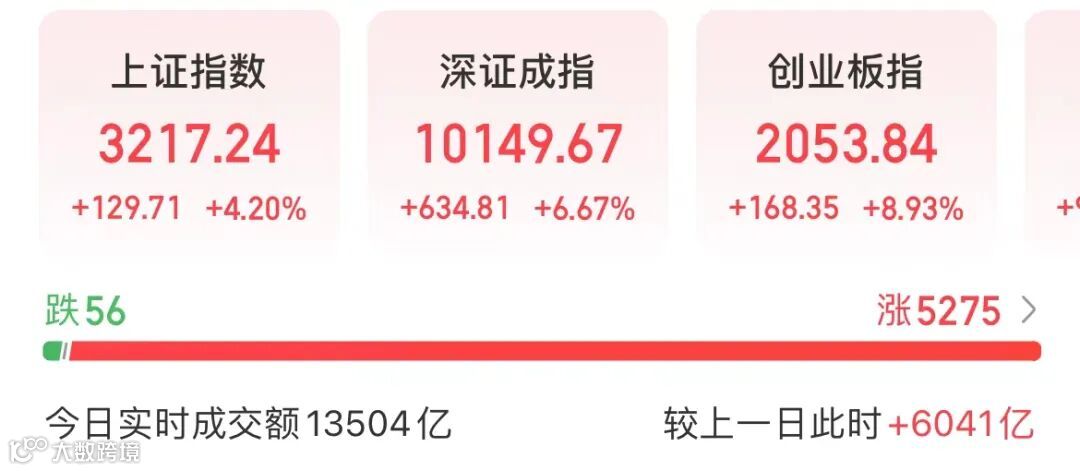 截至发稿,上证指数上涨4.20%,深证成指上涨6.67%,创业板指上涨8.93%。市场成交额为13504亿元,逾5200只个股上涨。