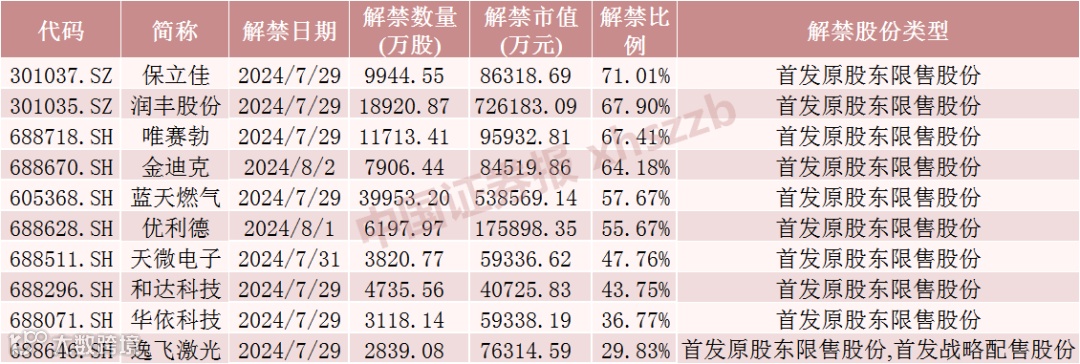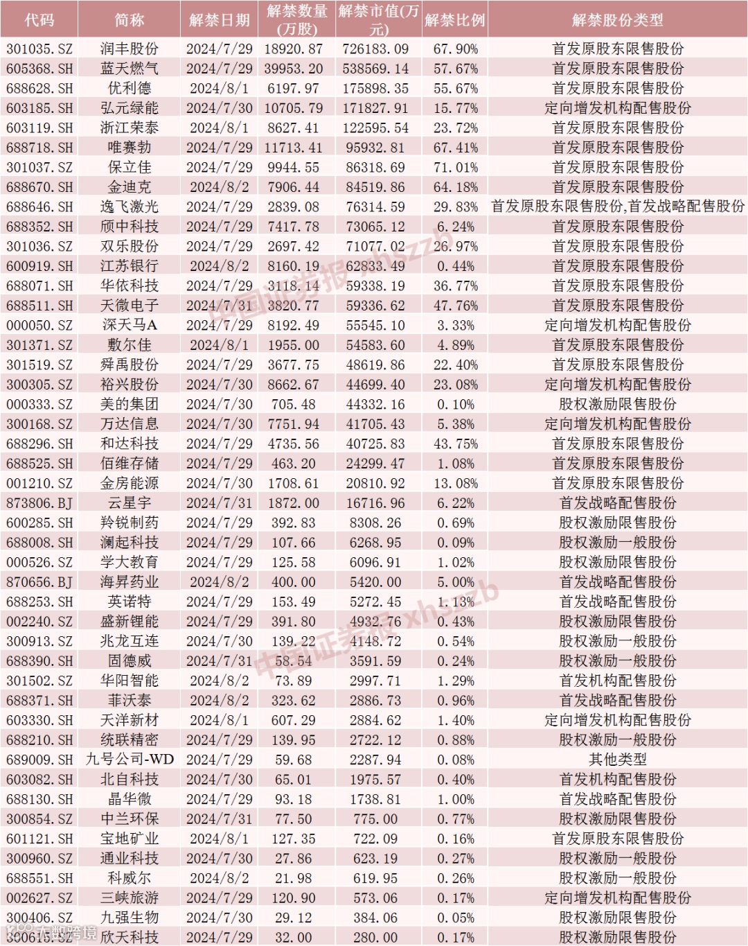 具体来看,Wind数据显示,润丰股份7月29日将解禁1.89亿股,均为首发原股东限售股份。蓝天燃气7月29日将解禁4亿股,均为首发原股东限售股份。优利德8月1日将解禁6197.97万股,均为首发原股东限售股份。