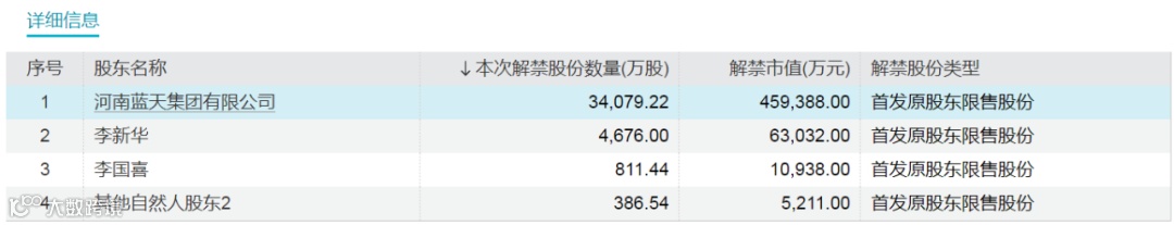 解禁市值第二大的蓝天燃气解禁股东为河南蓝天集团有限公司、李新华、李国喜等,其中河南蓝天集团有限公司为蓝天燃气第一大股东,李新华为蓝天燃气第二大股东、实控人、董事长。