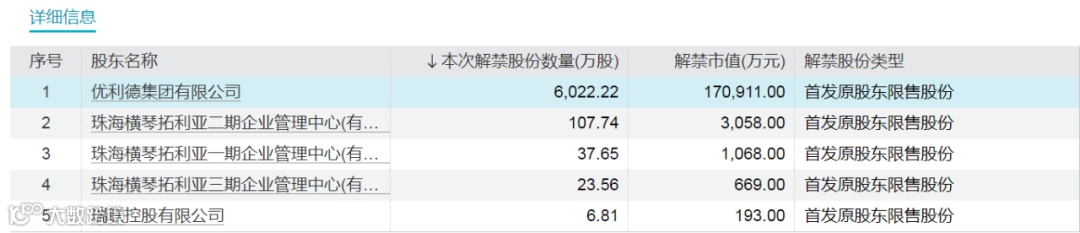 解禁市值第三大的优利德解禁股东为优利德集团有限公司、