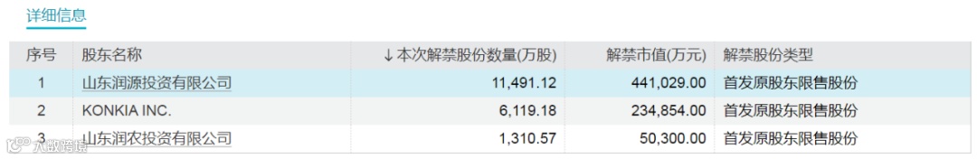 具体来看,在下周面临解禁的46只股票中,解禁市值最大的润丰股份解禁股东为山东润源投资有限公司、KONKIA INC.、山东润农投资有限公司,其分别为润丰股份第一、第二、第三大股东。